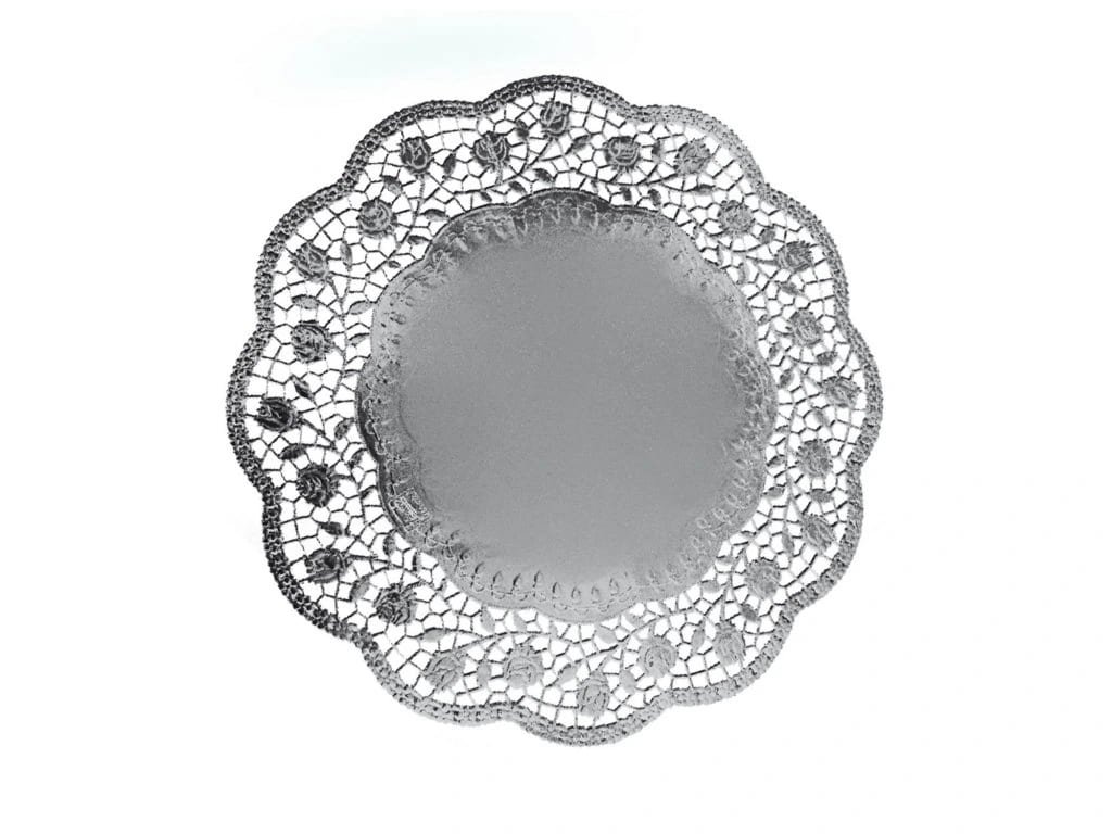 Kvalitné papierové dekoračné krajky s priemerom 36 cm v striebornej farbe. Okrúhle dekoračné krajky sú vhodné na servírovanie cukrárenských výrobkov a iných špecialít.