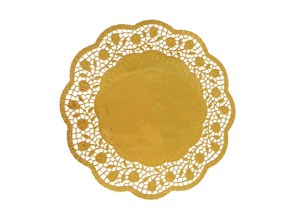 Kvalitné papierové dekoračné krajky s priemerom 36 cm v zlatej farbe. Okrúhle dekoračné krajky sú vhodné na servírovanie cukrárenských výrobkov a iných špecialít.