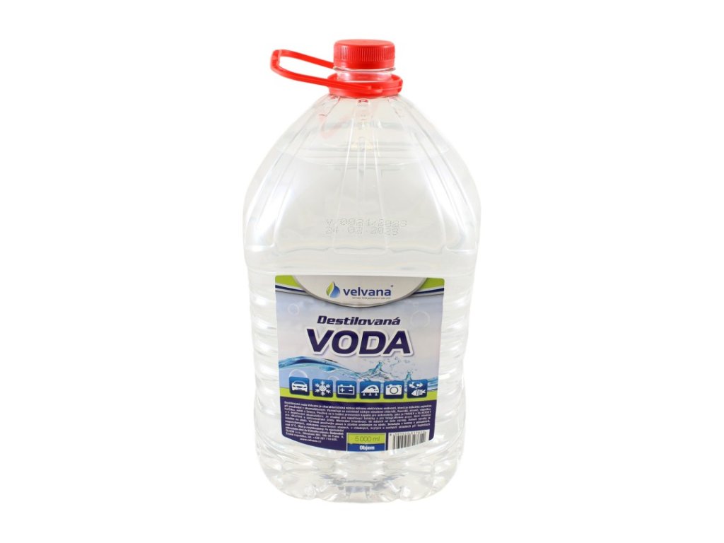 Destilovaná voda VELVANA 5L Destilovaná voda je kvapalina určená pre technické účely. Vhodná je napríklad pre úpravu koncentrácie chladiacich a nemrznúcich kvapalín, k doplneniu akumulátorov, vo fotografickej praxi, do naparovacích žehličiek a zvlhčovačov vzduchu. Nie je vhodná pre lekárske a potravinárske účely. Cena je za 1ks/5l