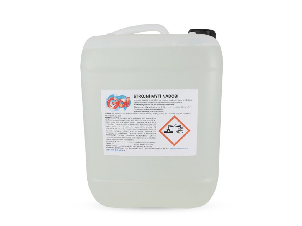 GO! Strojové umývanie riadu 10l Nepenivý alkalický prostriedok pre strojové umývanie riadu vo všetkých typoch umývačiek s možnosťou aplikácie tekutých prostriedkov. Prostriedok je určený len pre profesionálne použitie. Dávkovanie: 2-3g prípravku na 1 liter vody pomocou dávkovacieho čerpadla do umývacej zóny umývačky. Prípravok obsahuje: Hydroxid draselný Zloženie: 5% alebo viac, ale menej ako 15%: hydroxid draselný, fosfáty; menej ako 5%: EDTA a jej soli, 2-bromo-2- nitropropane-1,3-diol. NEBEZPEČENSTVO: Spôsobuje vážne poleptanie kože a poškodenie oči. Noste ochranné rukavice/ochranný odev/ochranné okuliare. PO POŽITÍ: vypláchnite ústa. NEVYVOLÁVAJTE zvracanie. PRI KONTAKTE S POKOŽKOU (alebo vlasmi): Vyzlečte všetky kontaminované časti odevu. Pokožku ihneď opláchnite vodou alebo sprchou. PO ZASIAHNUTÍ OČÍ: Niekoľko minút ich opatrne vyplachujte vodou. Ak používate kontaktné šošovky a je to možné, odstráňte ich. Pokračujte vo vyplachovaní. Okamžite volajte TOXIKOLOGICKÉ INFORMAČNÉ CENTRUM. Zneškodnite obsah/nádobu v súlade s miestnymi predpismi odovzdaním osobe oprávnenej na likvidáciu odpadu alebo na miesto určené obcou. Spotrebujte do 24 mesiacov od dátumu výroby uvedeného na obale.