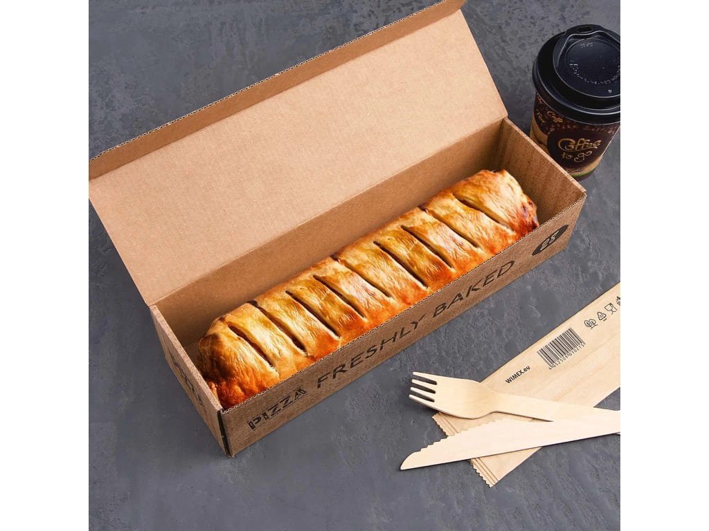 Krabica na pizza štangle/bagety a iné (mikrovlnitá lepenka) Roll-up kraft 28 x 8 x 7 cm [100 ks] je vhodná na pizza štangle a iné produkty z cesta, krabica je z pevnej elegantnej lepenky, skvelý pomocník na rozvozy alebo len tak zo sebou domov