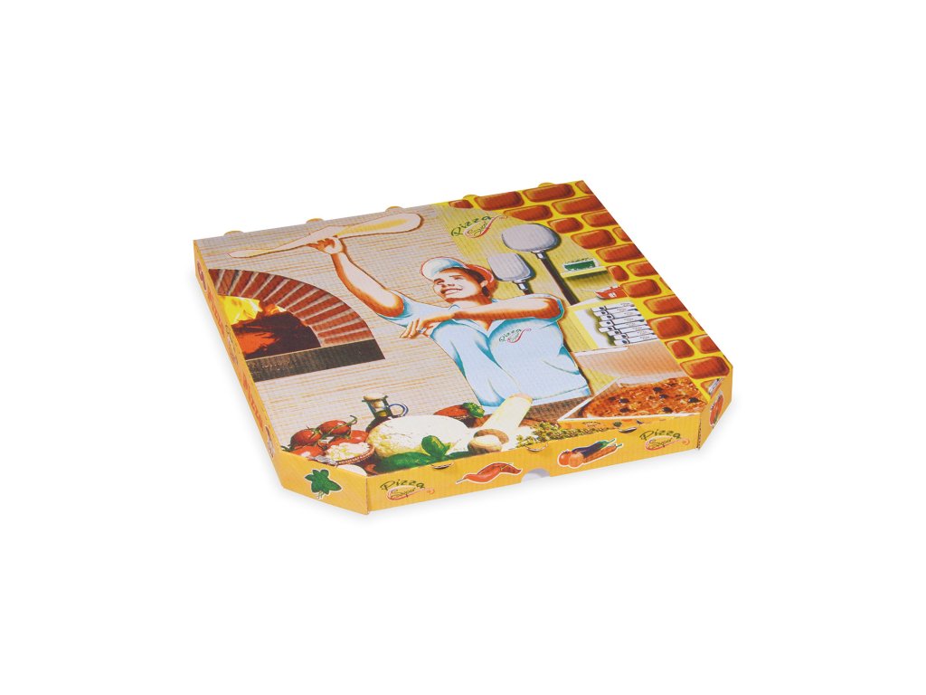 Krabica na pizzu je vyrobená z vlnitej lepenky.