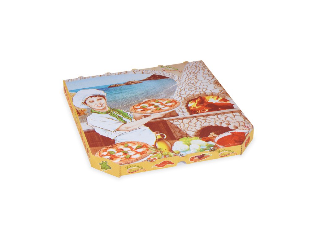 Krabica na pizzu je vyrobená z vlnitej lepenky.