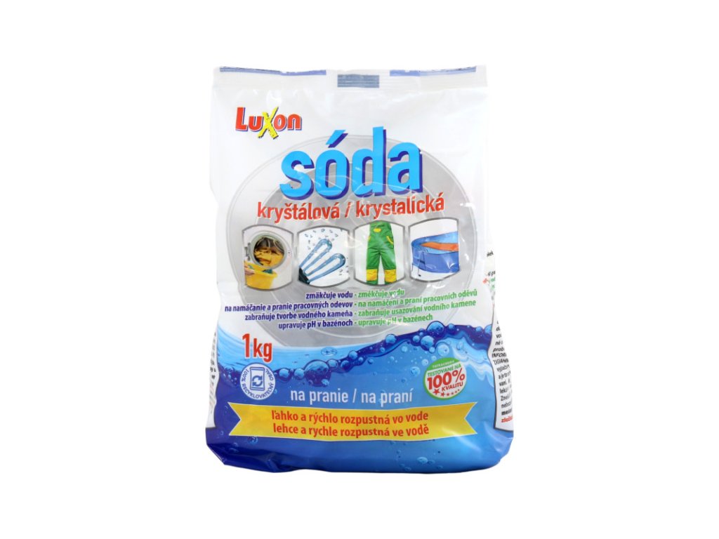 Luxon kryštálová sóda 1kg ľahko a rýchlo rozpustná na zmäkčovanie vody na namáčanie silne znečistených odevov (pracovné odevy, montérky) vhodná do automatických práčok zvyšuje účinnosť pracieho prášku zabraňuje usadeniu vodného kameňa vhodná na preplachovanie pivných trubiek na úpravu pH v bazénoch Návod na použitie: Namáčanie: 60 - 80 gramov na 10 litrov vody. Pranie v stredne tvrdej vode: 7,5 g na 10 l vody. Pranie vo veľmi tvrdej vode: 25 g na 10 l vody.Rovná polievková lyžica obsahuje cca 7,5 g sódy. Zloženie: dekahydrát uhličitanu sodného (ES 612-116-4). Pozor:Spôsobuje vážne podráždenie očí. Bezpečnostné upozornenie: Uchovávajte mimo dosahu detí.Po manipulácii starostlivo umyte ruky vodou a mydlom.Noste ochranné rukavice a ochranné okuliare. Prvá pomoc: PO POŽITÍ: Pri zdravotných problémoch volajte NÁRODNÉ TOXIKOLOGICKÉ INFORMAČNÉ CENTRUM alebo lekára. PO ZASIAHNUTÍ OČÍ: Niekoľko minút ich opatrne vyplachujte vodou. Ak používate kontaktné šošovky a je to možné, odstráňte ich. Pokračujte vo vyplachovaní.Ak podráždenie očí pretrváva: vyhľadajte lekársku pomoc. Pokyny na zneškodnenie: Zneškodnite obsah a obal v mieste zberu nebezpečného odpadu. Spotrebujte do 24 mesiacov od dátumu výroby. Balenie : 1000g