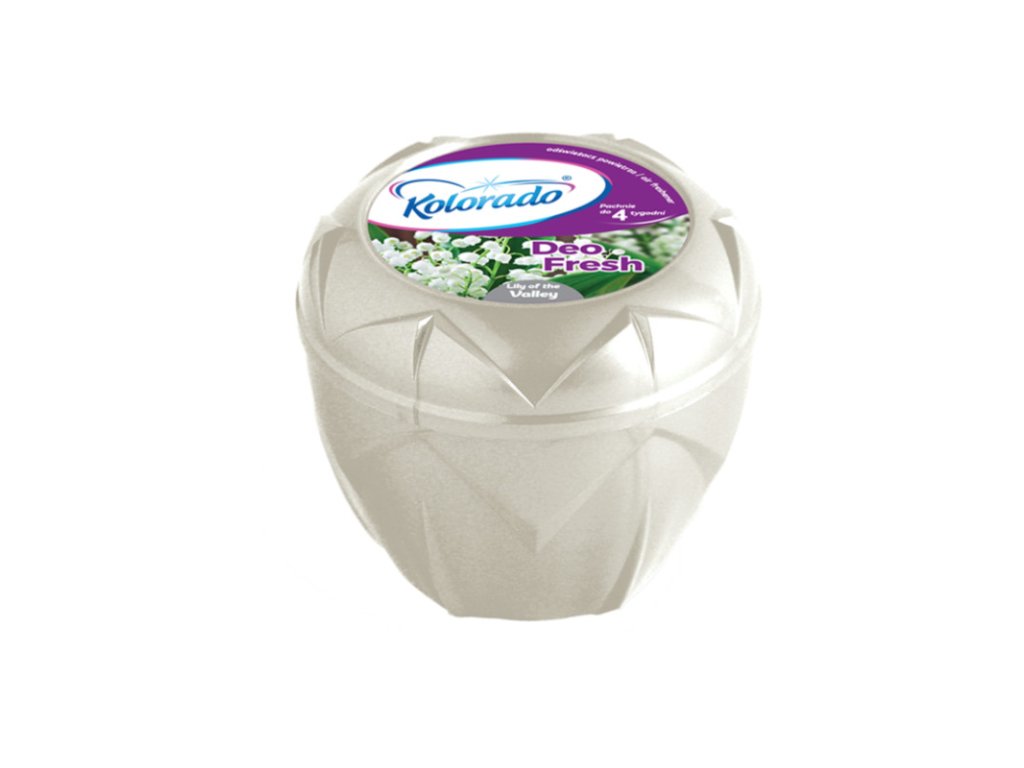 Osviežovač vzduchu Kolorado Deo Fresh KONVALINKA 150g • osviežovač vzduchu v géli • praktický tvar pre veľkú odparovaciu plochu • ovládanie intenzity vône s nastaviteľným viečkom • autentické vône • životnosť vône až 4 týždne Hmotnosť: 150 g
